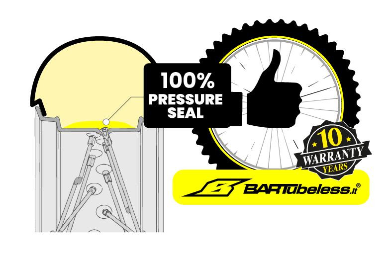 Lo speciale processo industriale e la speciale miscela di polimeri rende il prodotto Bartubeless efficiente e affidabile nel tempo. L’elasticità dello speciale polimero permette alla ruota di deformarsi senza far fuoriuscire l’aria dai nipples che durante le sollecitazioni si muovono nella loro sede a causa della deformazione elastica dei raggi.